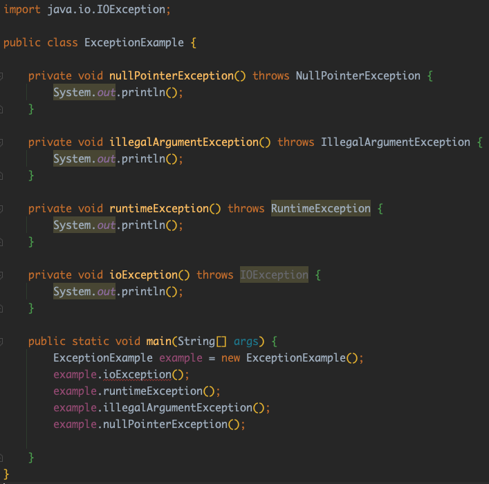 같이 throws에 넣어주게 되면 이러이러한 예외가 발생한다~ 정도를 나타내는 의미정도로 생각하면 되겠다.